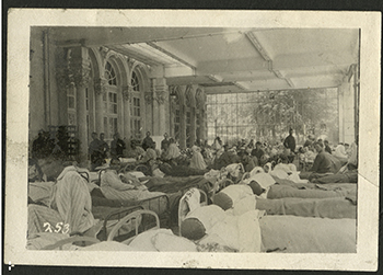 Patients convalesce inside U.S. Army Base Hospital #31, which had been transformed from a casino and hotel in Contrexeville, France, during WWI. Syracuse University medical school graduate Dr. Edward S. Van Duyn (1897) served at the hospital during his time as a military surgeon. From the Edward S. Van Duyn World War I Collection, courtesy of the Special Collections Research Center at Syracuse University Libraries