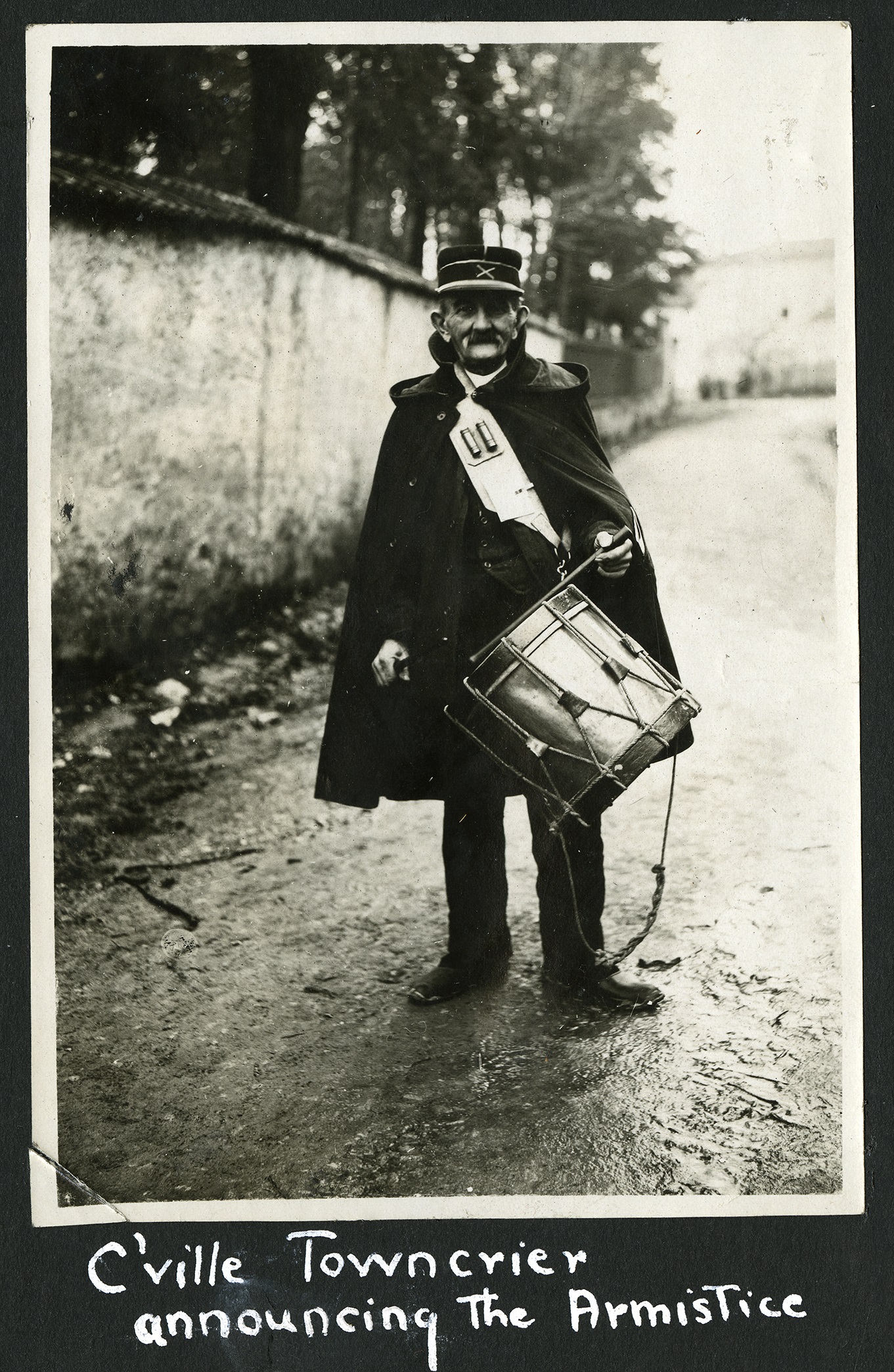 The town crier in Contrexeville, France, heralds armistice and the end of WWI. From the Edward S. Van Duyn World War I Collection, courtesy of the Special Collections Research Center at Syracuse University
