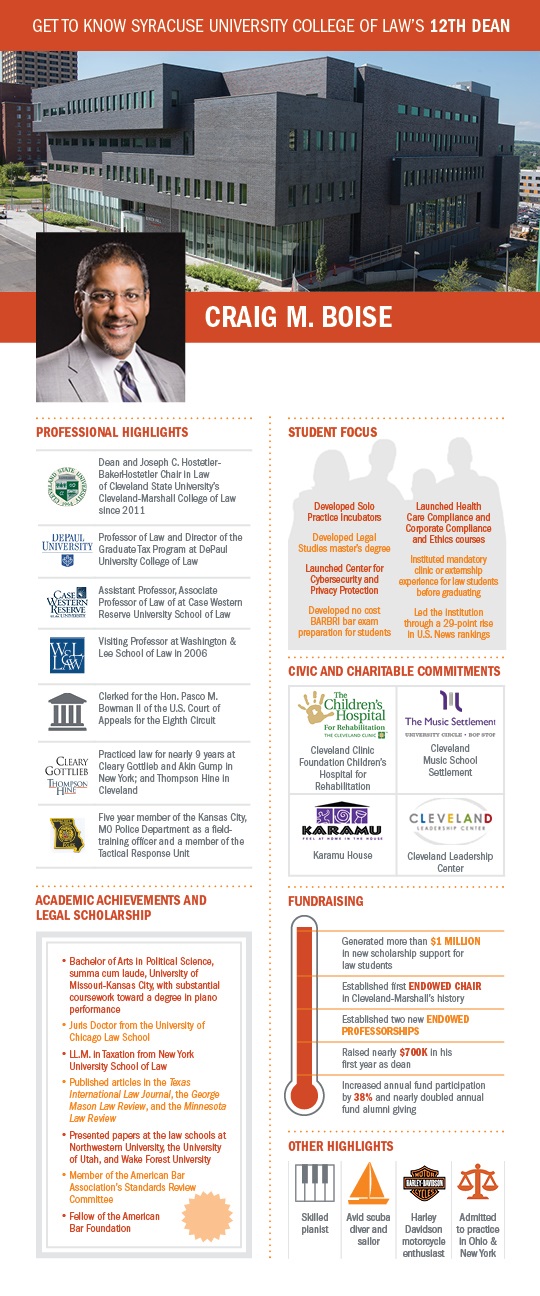 Recognized as an innovator in legal education, Craig M. Boise has been named dean of Syracuse University’s College of Law. Boise comes to Syracuse University from Cleveland-Marshall College of Law at Cleveland State University, which under his deanship made significant gains in academic programs, national rankings and fundraising. The Executive Committee of the Board of Trustees approved his appointment earlier today. Boise will assume his new role on July 1, 2016.