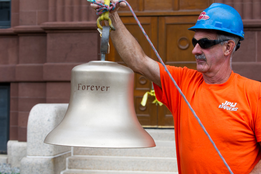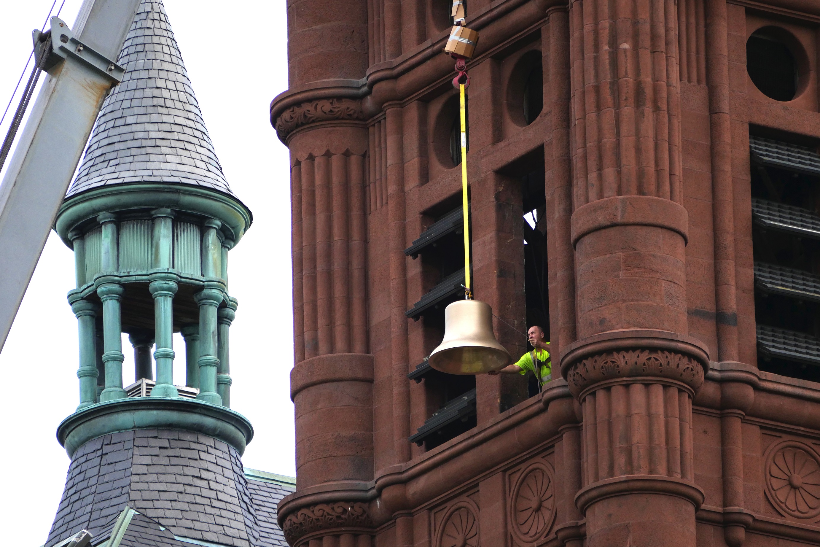 Over 125 years later, Timerman and Goldstein were among many who watched as workers maneuvered a large crane to carefully lift each precious bell into the tower where another worker awaited.