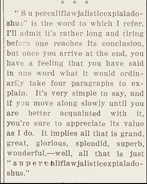 Three years ago, Zimmer told the Syracuse Post-Standard about a key discovery. An archivist with the Merriam-Webster dictionary supplied him with a file on the background of “supercal,” a word that has yet to find its way into the pages of that dictionary. The file included a clipping supplied in 1965 by Harvey Fortier, a Disney librarian.