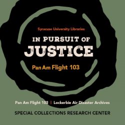 - The exhibition documents the Dec. 21, 1988 bombing of Pan Am Flight 103 over Lockerbie, Scotland that claimed the lives of 270 individuals, including 35 students returning from studying abroad through Syracuse University. Featuring materials donated to Libraries’ Research Center by victims’ loved ones and investigative team members, the exhibition provides an overview of the disaster, investigation and first trial.