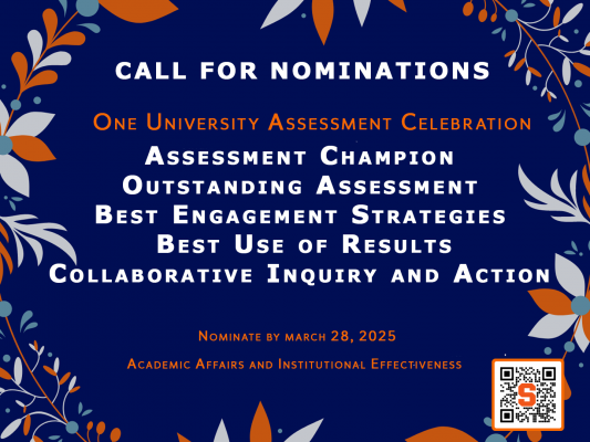 Academic Affairs and Institutional Effectiveness (IE) are pleased to announce a call for nominations for Syracuse University’s One University assessment awards. Self-nominations or nominations by campus community members will be accepted through Friday, March 28.