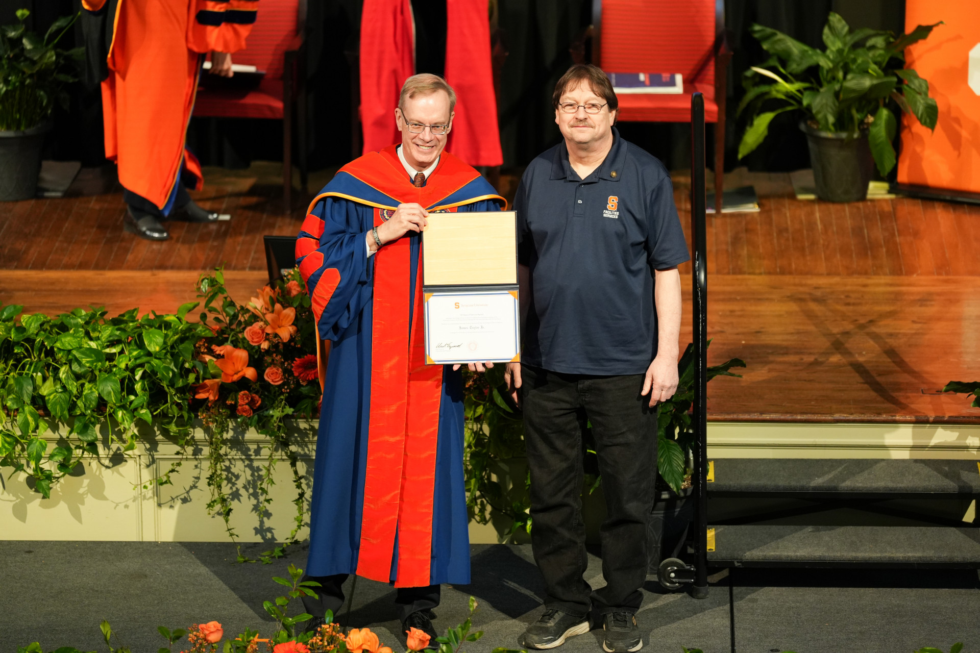 The Hendricks Chapel Choir performed “I Was Glad” under the direction of graduate student conductor Ben O’Connell. (Photos by Amy Manley)Mace Bearer Bea González prepares to pass the charter mace to incoming Mace Bearer Samuel Clemence, professor emeritus in the College of Engineering and Computer Science.Chancellor Kent Syverud offered opening remarks.Incoming Mace Bearer Samuel Clemence is pictured during the ceremony.Emma Klein, a member of the women’s soccer team, was one of three honored with the Student-Athlete Award.James “Jimmy” Taylor Jr., a staff member in Facilities Services, was honored for 50 years of service.Bill Coplin, Laura J. and L. Douglas Meredith Professor for Teaching Excellence and professor of policy studies in the Maxwell School of Citizenship and Public Affairs, acknowledges congratulations from the audience upon the announcement of his 55 years of service to the University.Craig Tucker, director of Higher Education Opportunity Program and Trio Student Support Services programs, receives the Enduring Values Award.Howard G. Adams G’79 (center), founder and president of H.G. Adams & Associates Inc., and an alumnus of the School of Education, received the Tolley Medal from Chancellor Syverud (left) and Kelly Chandler-Olcott, dean of the School of Education.Qingyang Liu, a doctoral candidate in the Department of Human Development and Family Science in the Falk College of Sport and Human Dynamics, received the Chancellor’s Citation for Excellence in Student Research (graduate).Emma Karp, operations assistant in Campus Dining and Catering, received the Chancellor’s Citation for Outstanding Contributions to the Student Experience and University Initiatives (support staff).James Clark, professor and program coordinator for theater management in the College of Visual and Performing Arts, received the Chancellor’s Citation Lifetime Achievement Award.Cydney Johnson, deputy county executive for physical services for Onondaga County and the University’s former vice president for community engagement and government relations, received the Chancellor’s Medal from Chancellor Syverud.Bill Coplin, Laura J. and L. Douglas Meredith Professor for Teaching Excellence and professor of policy studies in the Maxwell School of Citizenship and Public Affairs, received the Chancellor’s Medal from Chancellor Syverud.Students (from left) Yifan “Ivan” Shen, Mason Romero, Joshua Garvin, Jennifer LaMonica and Ryan Myers led the alma mater to conclude the program.