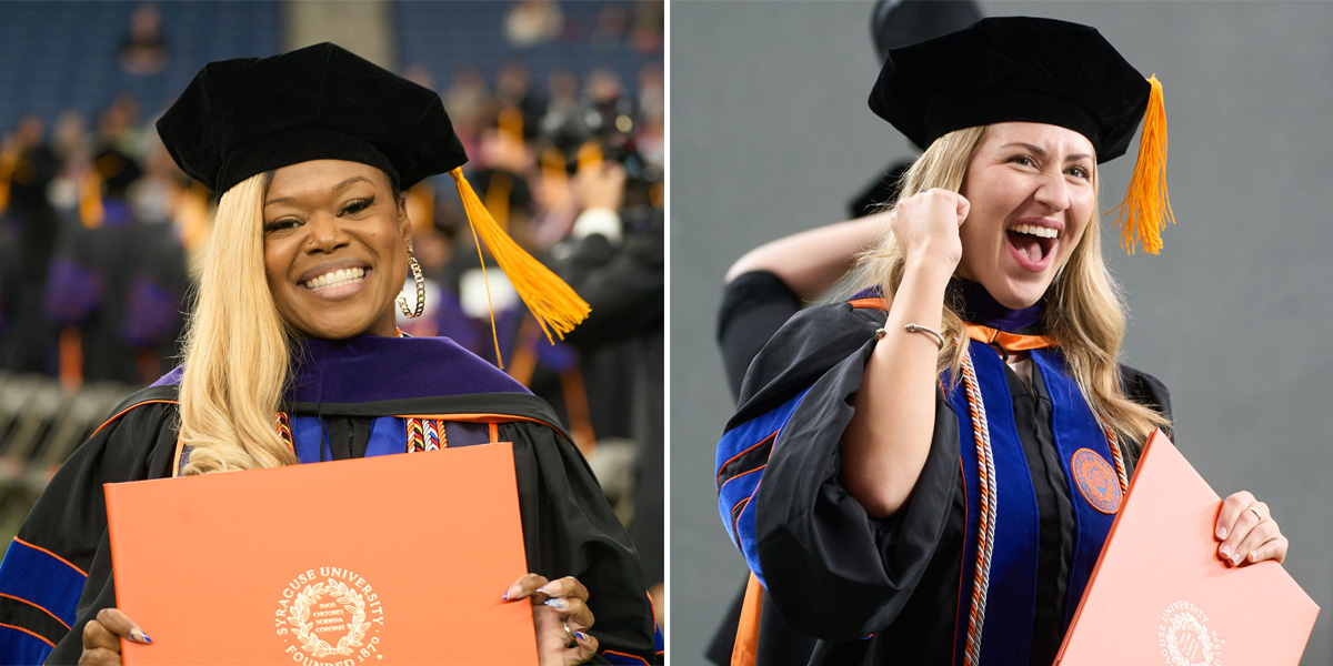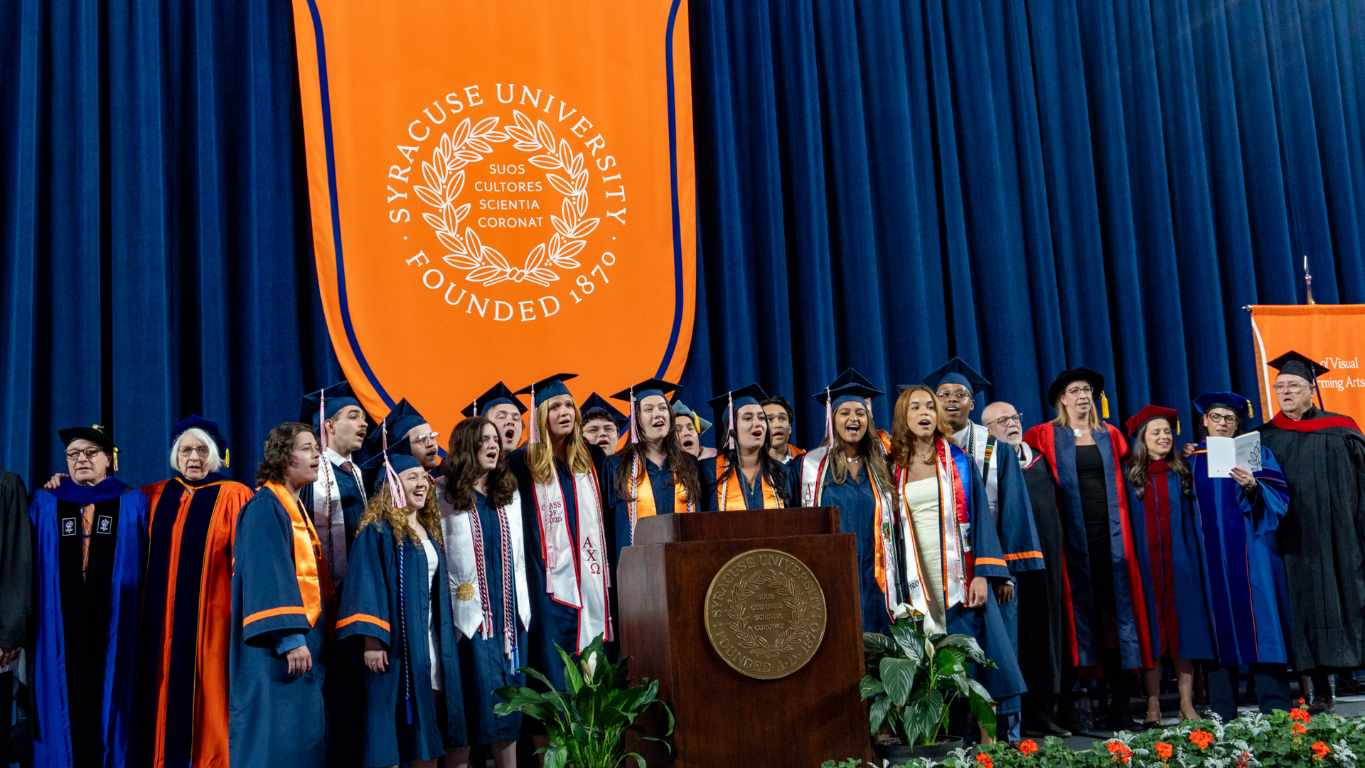 Keynote speaker Carmelo Anthony addresses the Class of 2025 from the podium. (Photo by Amy Manley)Chancellor Kent Syverud offers remarks to the crowd of graduates and their loved ones. (Photo by Coco Boardman)University Scholar Jonathan Collard de Beaufort ’25 was selected as the student speaker on behalf of the Class of 2025. (Photo by Amy Manley)Commencement 2025 (Photo by Amy Manley)College of Arts and Sciences alumnus Robert “Bob” Mankoff ’66 (right) was awarded an honorary doctor of letters degree by Chancellor Syverud. (Photo by Amy Manley)Ali Meders-Knight (right), executive director of California Open Lands and Mechoopda tribal member, was awarded an honorary doctor of human letters degree by Chancellor Syverud. (Photo by Amy Manley)School of Education alumna Judith Greenberg Seinfeld ’56 (right) received an honorary doctor of humane letters degree from Chancellor Syverud. (Photo by Amy Manley)You did it, Class of 2025! (Photo by Amy Manley)Graduate School Marshal Qingyang Liu waves to the crowd as she processes. (Photo by Amy Manley)Carmelo Anthony (Photo by Amy Manley)Commencement 2025 (Photo by Marilyn Hesler)Bea González G’04, former vice president for community engagement, special assistant to the chancellor and dean of University College, served as mace bearer. (Photo by Angela Ryan)A student celebrates with loved ones on the Shaw Quad after the ceremony. (Photo by Amy Manley)From left: Lois Agnew, interim vice chancellor and provost; Jonathan Collard de Beaufort ’25, student speaker; Jeffrey M. Scruggs, chair of the Board of Trustees; Commencement speaker Carmelo Anthony; and Chancellor Syverud. (Photo by Coco Boardman)Commencement 2025 (Photo by Amy Manley)The obligatory cap toss (Photo by Amy Manley)When Commencement falls on Mother’s Day, mom deserves a shout-out too! (Photo by Amy Manley)Commencement 2025 (Photo by Angela Ryan)Would it even be Commencement without Otto the Orange? (Photo by Amy Manley)Commencement 2025 (Photo by Amy Manley)Commencement 2025 (Photo by Angela Ryan)Commencement 2025 (Photo by Amy Manley)Jeremy Jordan, dean of the Falk College of Sport and Human Dynamics, takes a selfie with Otto and graduating students during the college’s Convocation event. (Photo courtesy of the Falk College on Facebook)Maxwell grads pose with Dean David M. Van Slyke (far left) during the Maxwell School of Citizenship and Public Affairs Convocation. (Photo courtesy of the Maxwell School on X)Celebrating on the Quad after the College of Professional Studies Convocation on May 8. (Photo courtesy of the College of Professional Studies on Facebook)Sawyer Duserick ’25 is pumped to graduate magna cum laude from the Falk College. (Photo courtesy of Lea and Shannon Duserick)Spotted at the College of Engineering and Computer Science (ECS) Convocation: “It’s Just Rocket Science.” (Photo courtesy of ECS on Facebook)An Orange diploma is a beautiful sight. (Photo courtesy of ECS on Facebook)All smiles at the College of Law Commencement on May 9. (Photos courtesy of the College of Law on Facebook)From left: Newhouse Class Marshal Charlotte Ebel ’25, national anthem singer Lauren Juzang ’25, Newhouse Convocation keynote speaker Jim Weiss ’87, undergraduate speaker Naimah Rahman ’25 and Newhouse Class Marshal Ryan Myers ’25. (Photo by Genaro C. Armas)Singers onstage at the College of Visual and Performing Arts (VPA) Convocation (Photo courtesy of VPA on Facebook)Graduates from the School of Information Studies pose outside of Hinds Hall. (Photo courtesy of the iSchool on Facebook)Bauer, the Whitman School of Management’s pet therapy dog, donned a special cap and bowtie to help celebrate the occasion. (Photo courtesy of the Whitman School on Facebook)