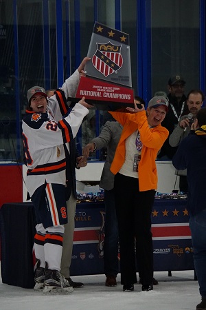 After winning their playoff games, including a close call against their opponent in the championship game , the University of Tampa, the team was nervous to get on the ice, but still as focused as ever on winning a title. “The score from that game [against Tampa the day before] was close and we all knew that Tampa would be coming out hard [in the championship] because of that,” says Wheeler. “I don’t think anyone [on our team] sat down during the entire game. It was constant cheering, singing and dancing, no matter what the score was. We just needed to calm our nerves and keep the energy up.”